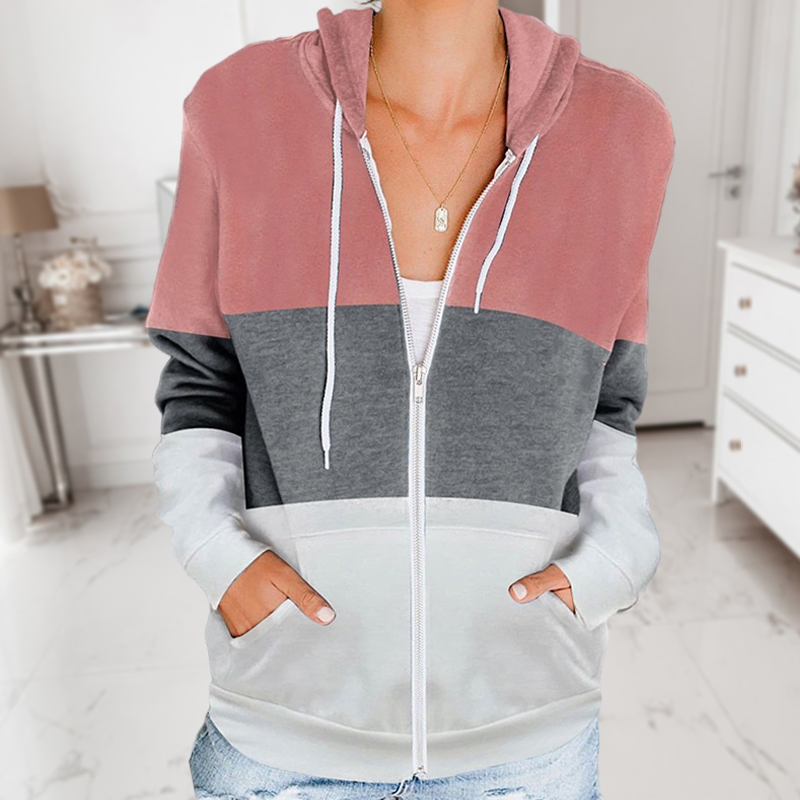 Color Blocking Zipper Drawstring Long Sleeve Hooded Sweatshirt