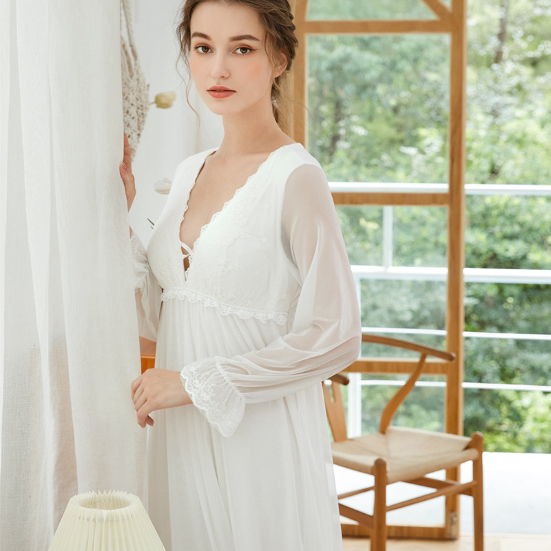 Gorgeous and delicate, this nightgown with plunge neck and tulle sleeves will find a forever place in your wardrobe! Featuring elegant lace mesh and floaty skirt hemline, it's easy to highlight your feminine touch. This maxi nightie is so soft and comfortable to wear at home.