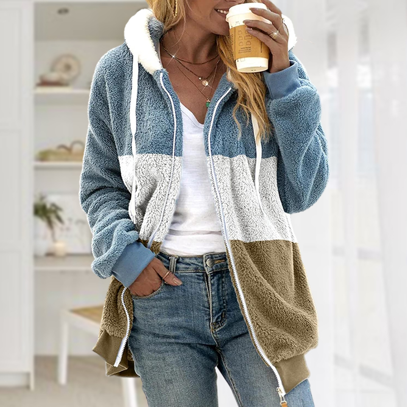 Plus Size Color Block Long Sleeve Hooded Drawstring Fleece Jacket