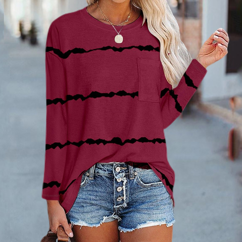 This women's long sleeve Fall pullover t-shirt has a casual loose fit design, which is loose, comfy and shields the belly. Stylish round neck pullover t-shirt with chest pocket, stripe color block design,casual and full of youthful vitality. Good for fall, winter, or spring seasons. An essential for every fashion women or girl.