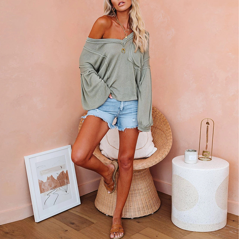 V-neck Pocket Solid Color Long Sleeve Knit Top