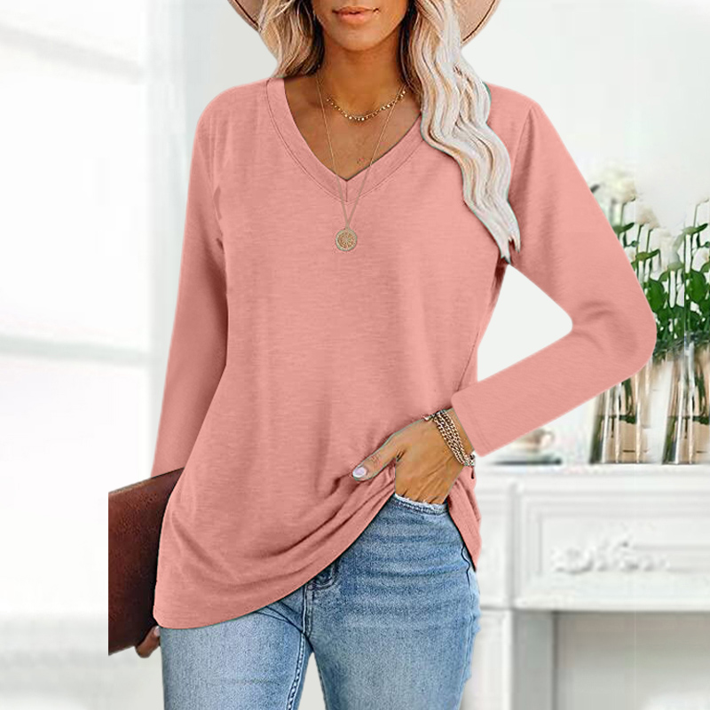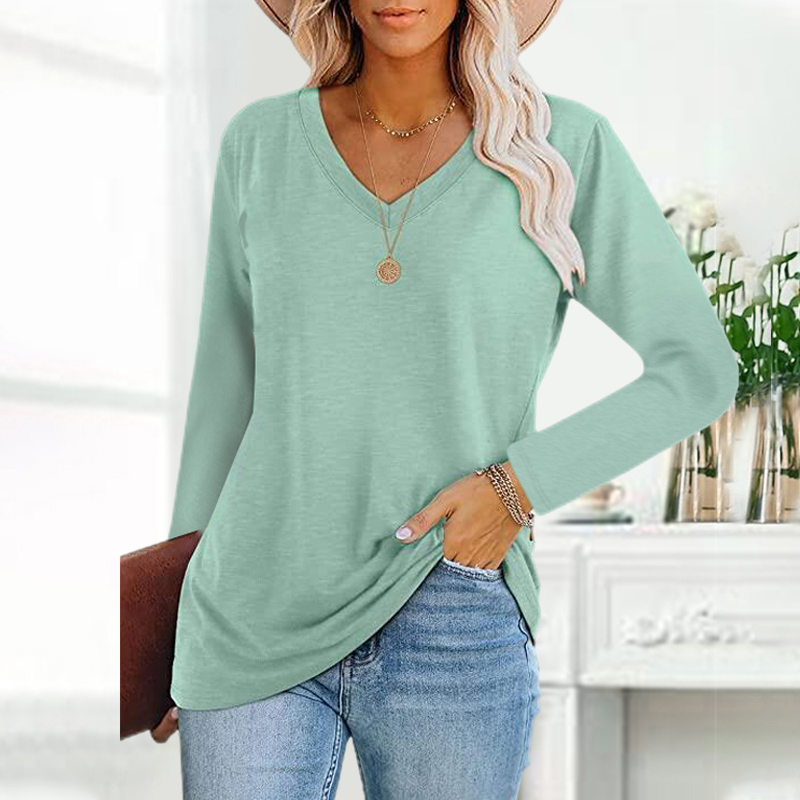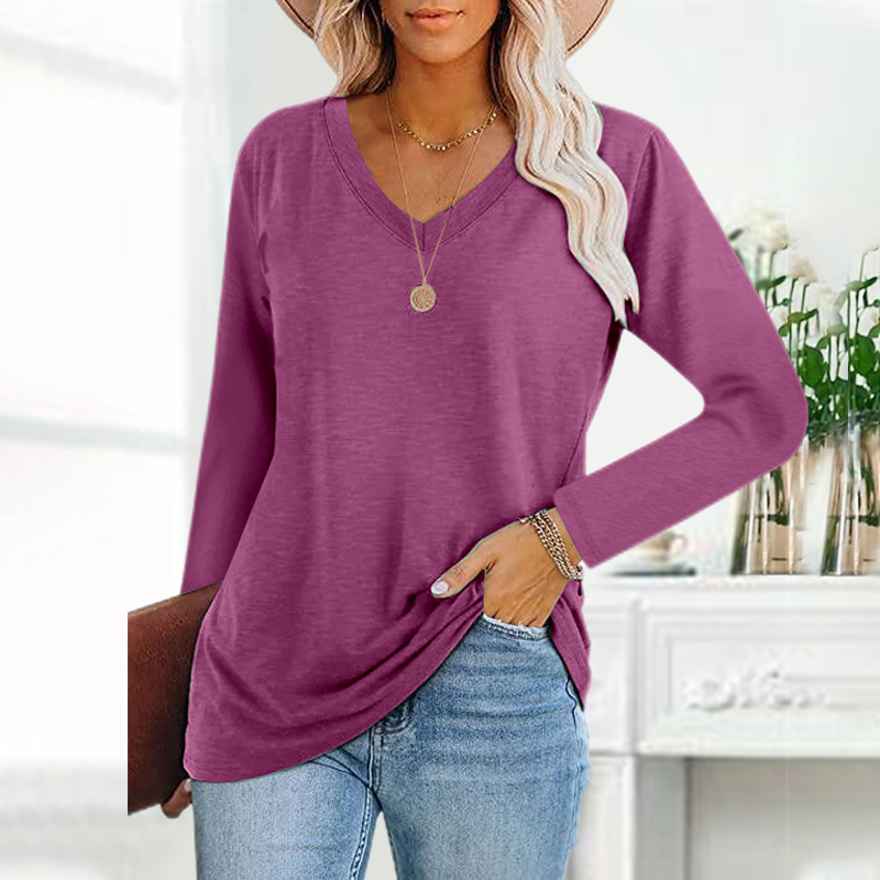 V-neck Solid Color Long-Sleeved Casual T-shirt